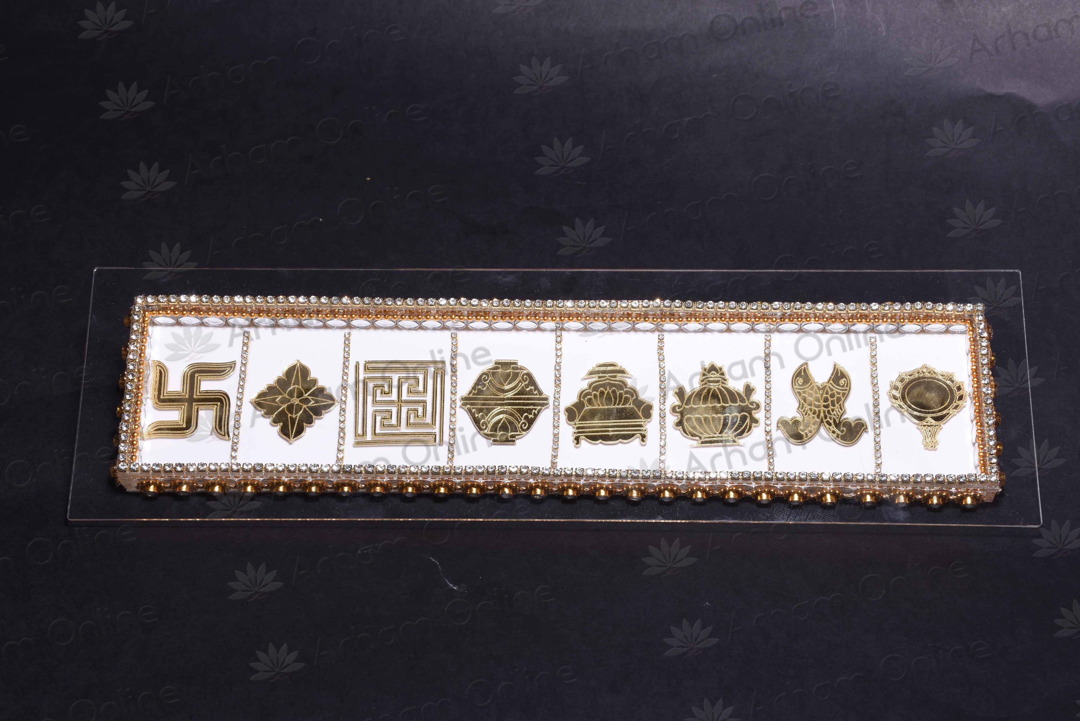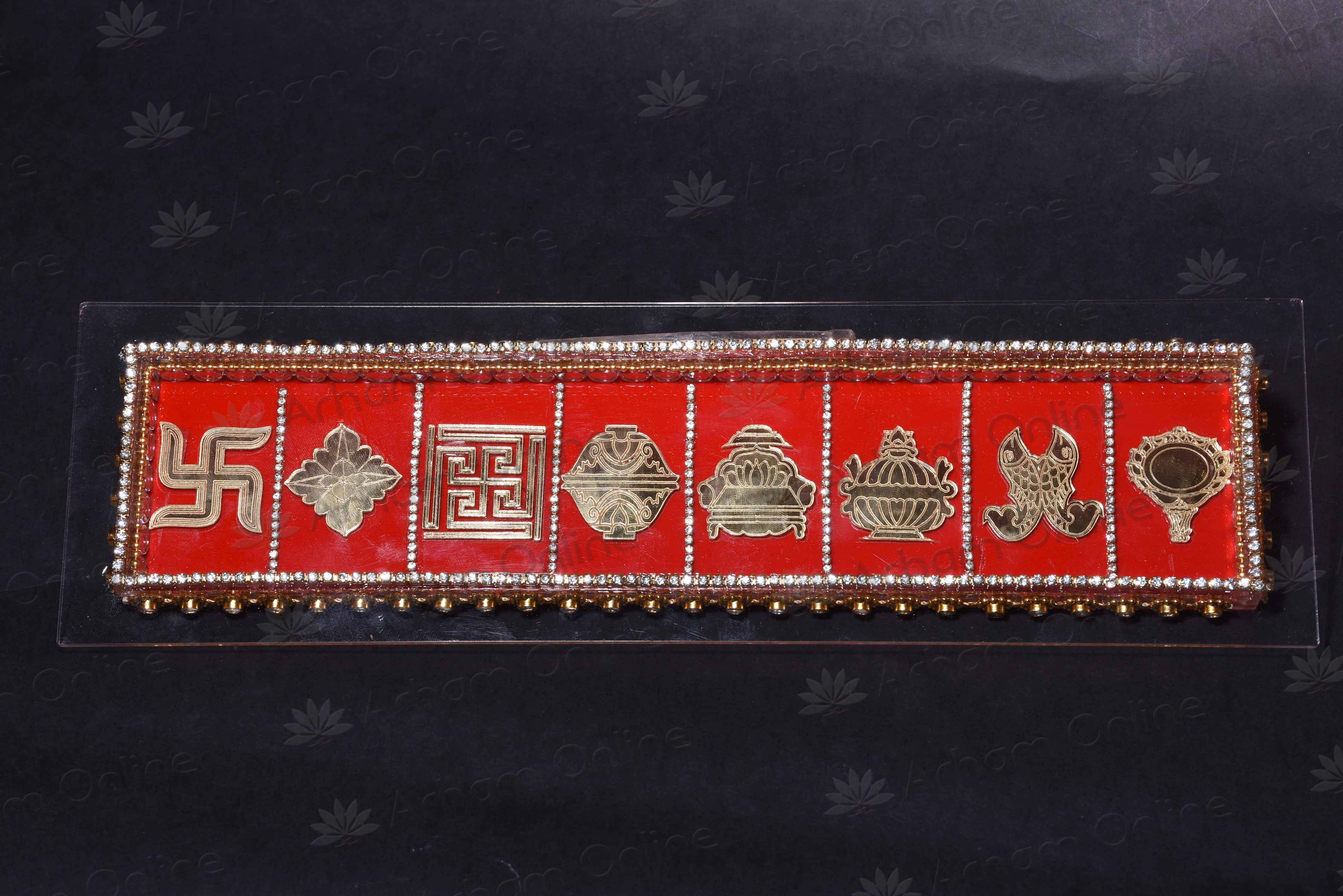 this patti has mangals like swastik,sampoot,nandavart,bhadraasan,darpan,meenyugal,shreevatsa,kalash etc are there in this toran for good omen in our house,office etc,we can tie it anywher we wish.used to hang on the main door of our house to keep people know that this house belongs to a jain family