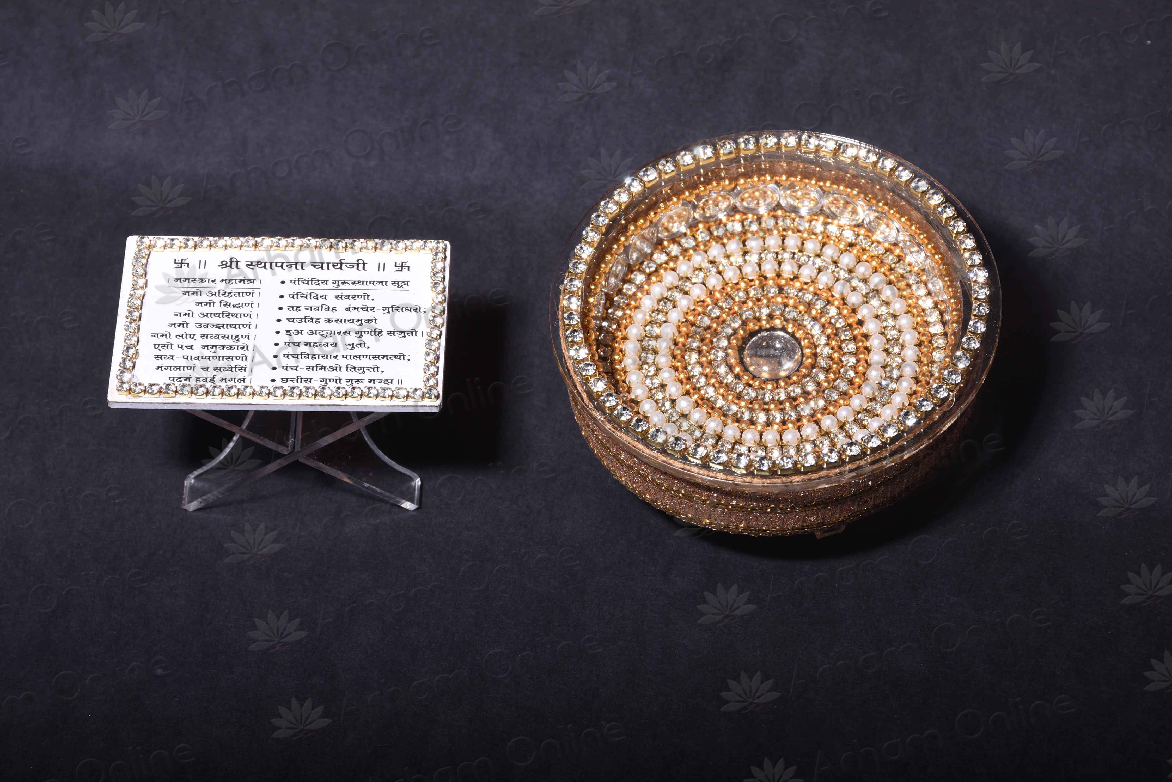 We use sthapnacharya when we want to do samayik or?pratikramanit consists of small sapda (thamni) and a small board with namaskar mahamantra and panchindiya written on it